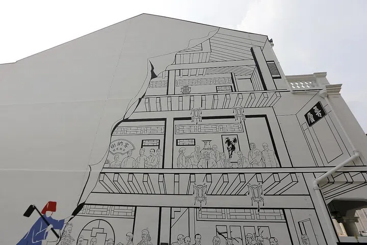 In this artwork on the side of the 111-year-old Goh Loo Club, a Samsui woman "peels away" the wall to reveal a historic scene in the three-storey shophouse.
