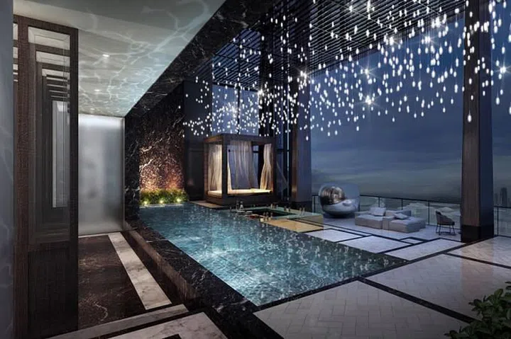 (The apartment at the top of GuocoLand's project has a pool, cabana, entertainment area, jacuzzi and panoramic views of the CBD, Marina Bay and Sentosa.)