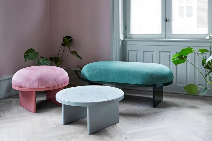 Meaning "to sit at ease" in Japanese, Anza comprises a pouf, bench and coffee table. The collection was created by Portuguese designer Rui Pereira and Japanese designer Ryosuke Fukusada, who updated a Kyoto-based textile originally produced in the 18th century with a patchwork pattern and new colour scale.