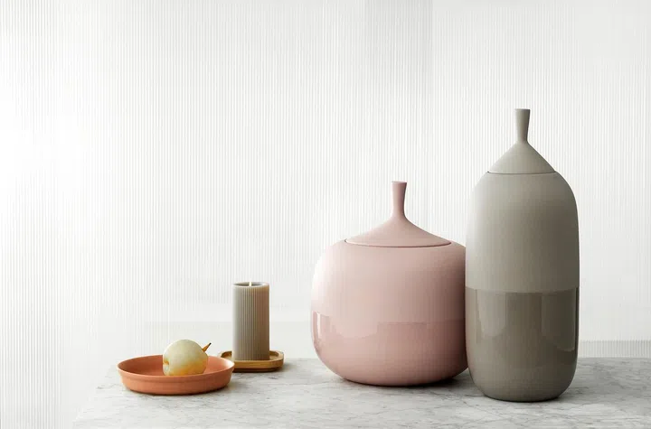 Designed by Daniel Debiasi and Federico Sandri, these ceramic jars -- available in black, grey, dusty blue or pink -- have an organic silhouette and feature a contrast between the matte and glossy glazing. They can be used for storage, as a vase or as an element of decoration.