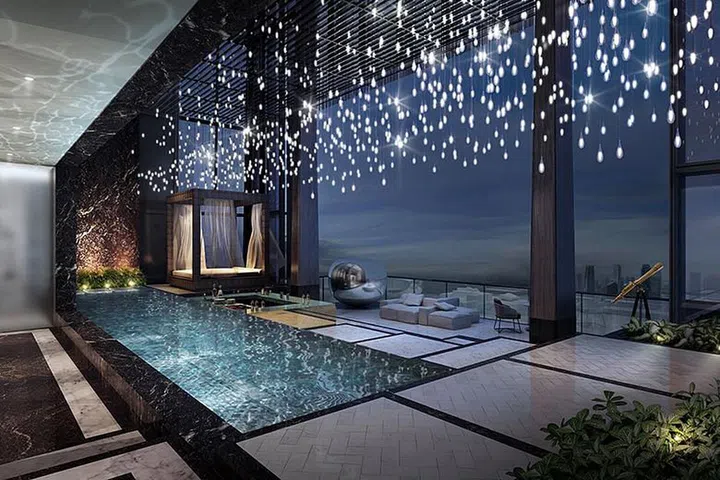 The biggest of these "super penthouses" in Singapore is in Wallich Residence, with a floor area of 21,108 sq ft and a building height of 950 ft. Spanning levels 62 to 64, the property has five bedrooms, a family room, a viewing deck, a private garden, a 12m pool, a cabana, a jacuzzi, an entertainment room and bar facilities.