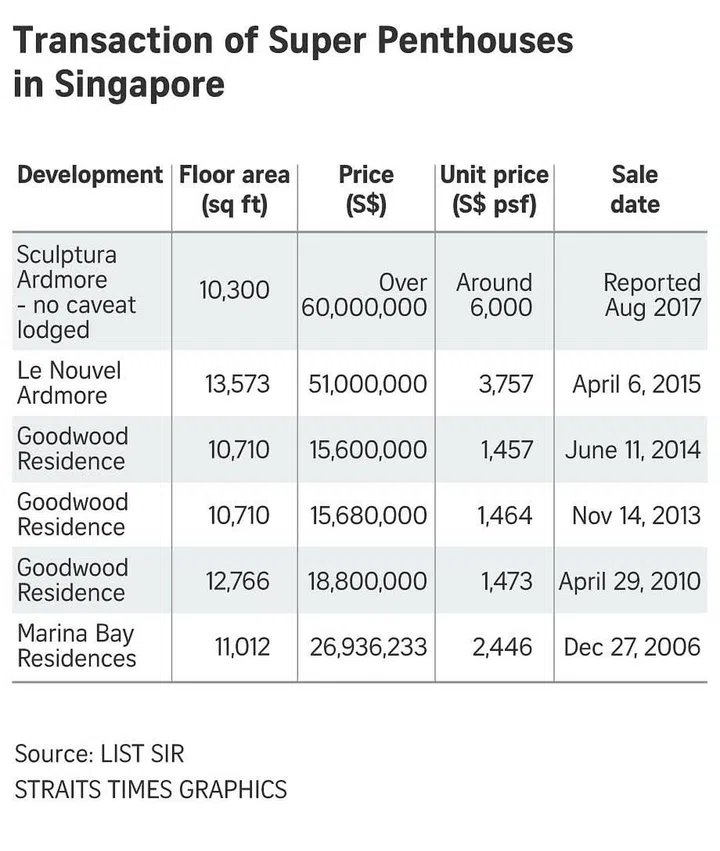 Super penthouses, as defined by the luxury brokerage, are penthouses which are 10,000 sq ft and above - about 10 times an average four-room HDB flat. Those located in "super tall" buildings which are 1,000 to 1,900 ft in height, found in major global cities, tend to fetch more attention and set record prices due to spectacular views offered, List SIR said.