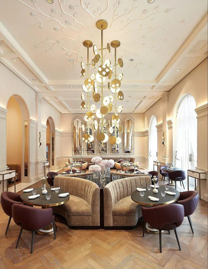 The restaurant has been described as her “most feminine” yet, with plenty of pink pastel hues, floral motifs, and metallic accents all tied together by a central chandelier with laser-cut spades — a play on the restaurant’s name, which translates as “the queen of spades”.