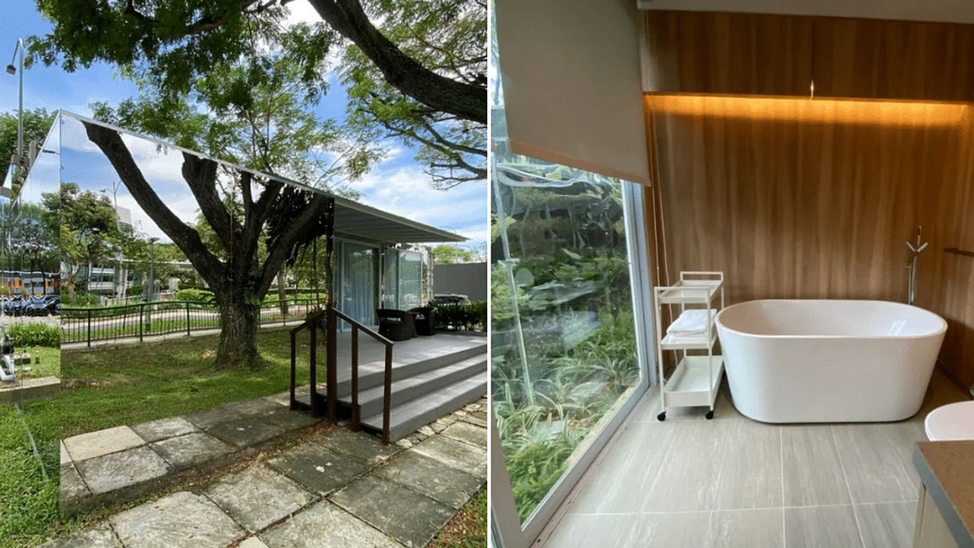 With warm wood furnishings and a minimalist vibe, the bathroom affords views of the greenery outside while you enjoy a leisurely soak in the bathtub. And since the exteriors are mirrored, you won’t have to worry about privacy concerns.