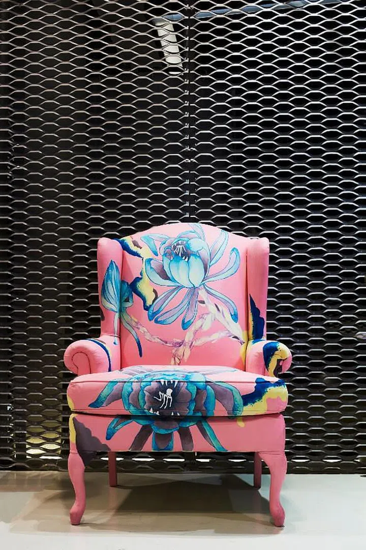 Pictured: An armchair hand-painted with the Queen of the Night flower by Adeline Tan, also known as Mightyellow, is available for sale at Keepers.