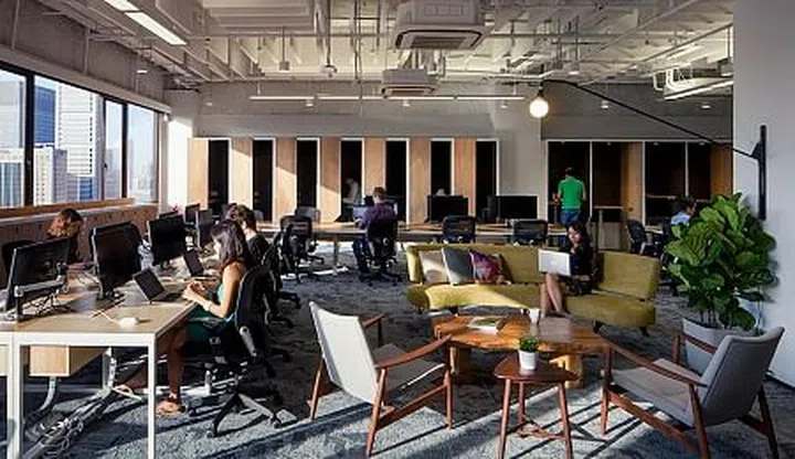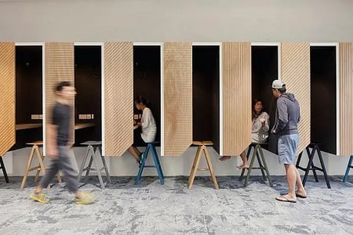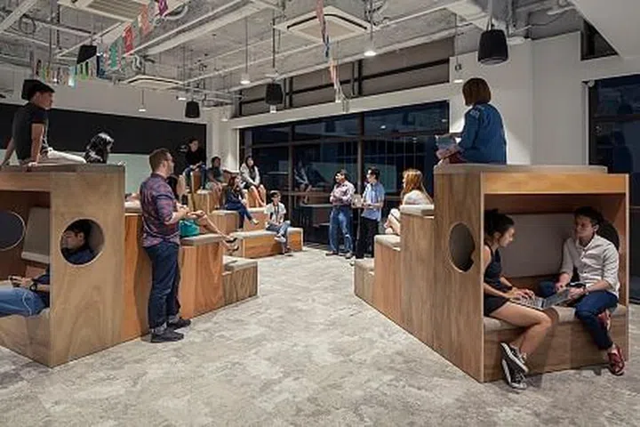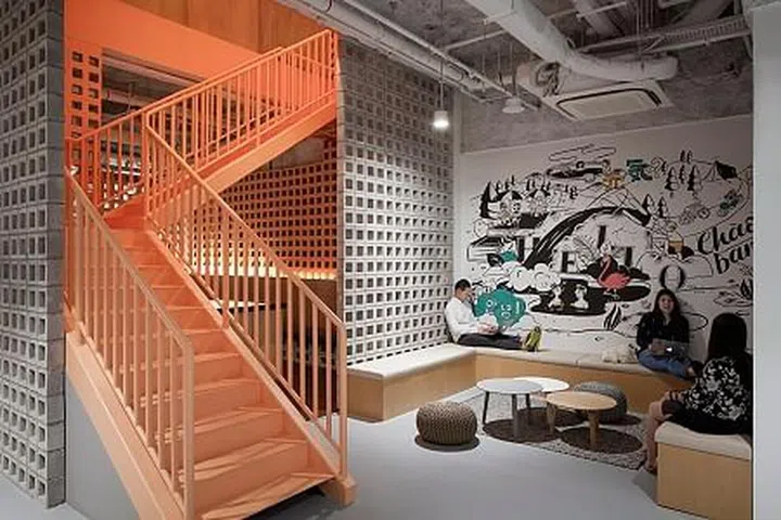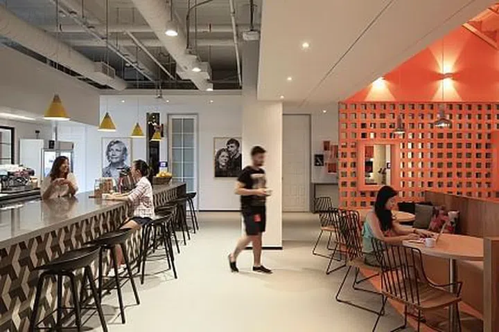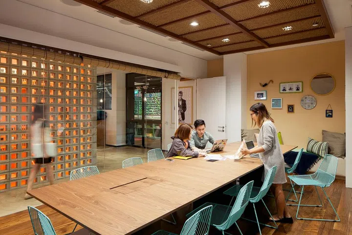 The office is designed with informal elements, such as a contemporary-styled kopitiam, shared working spaces, as well as benches and beanbags for breakout meetings.