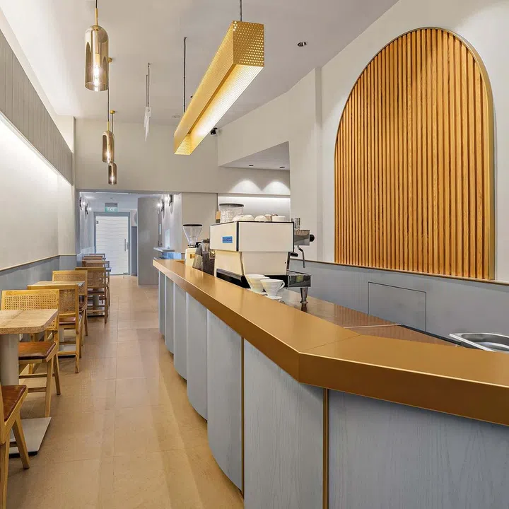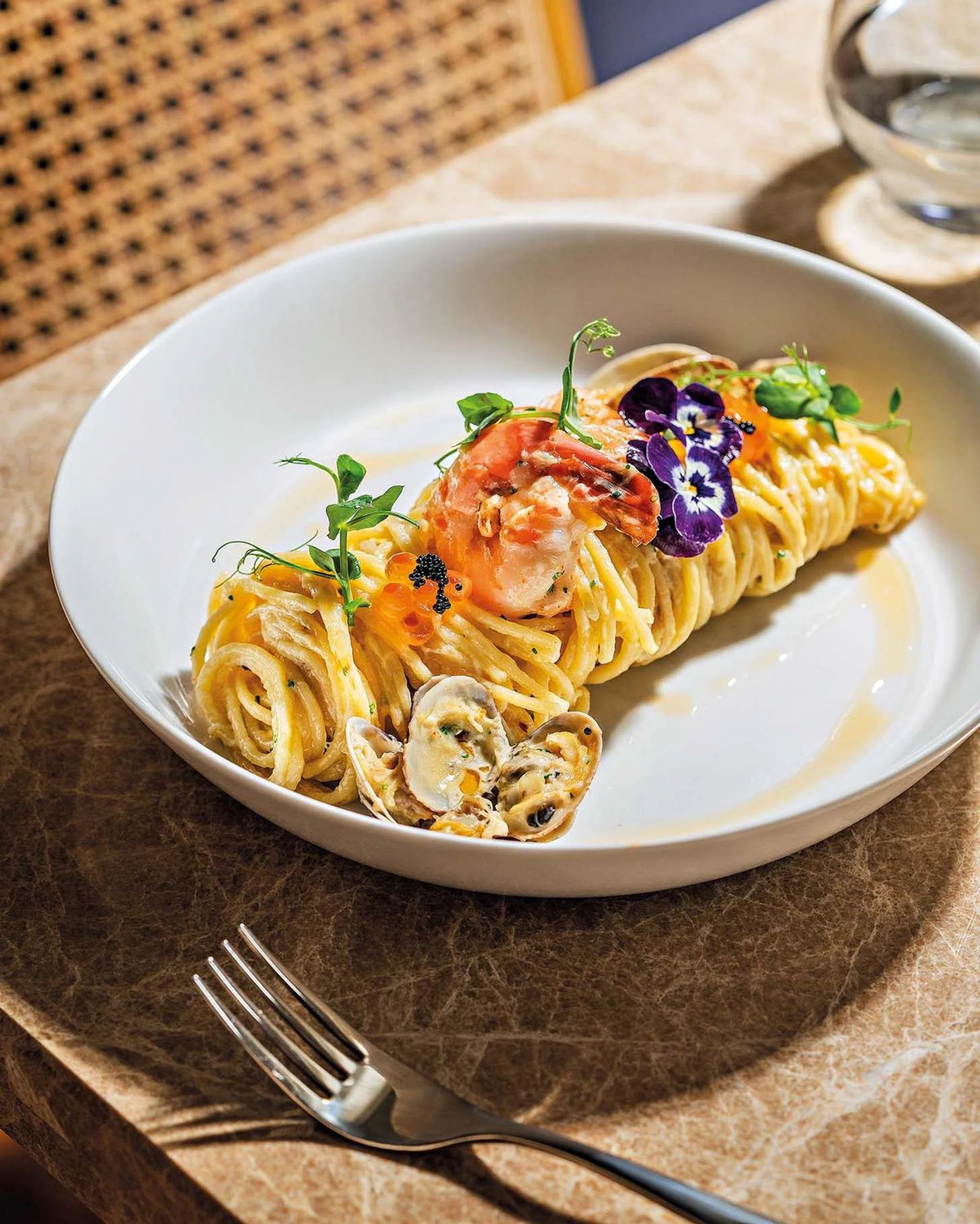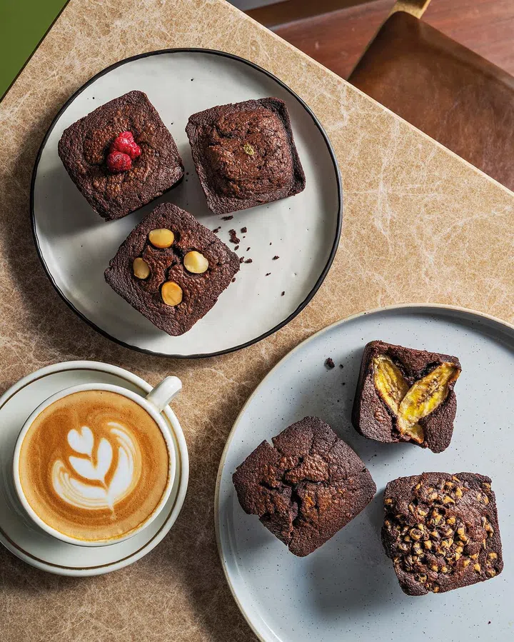 Once inside, you’re greeted with the aroma of freshly-ground coffee beans wafting from the coffee bar taking centrestage on the first floor. Here, you have your pick of seating options: grab a barstool at the counter for a quick bite, take a seat at one of the emperador marble tables for lunch, or head upstairs for a more intimate group gathering. Awash in pastels and light wood, the space is warm and welcoming any time of the day.