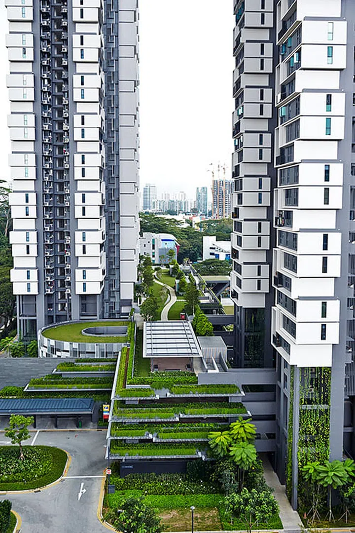 Green plants trail down landscaped link bridges between the blocks at Sky Terrace.