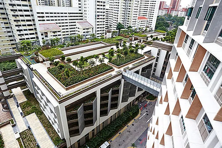 Greenery in Sky Terrace extends from the facade of the multistorey carpark building to the roof garden above it.