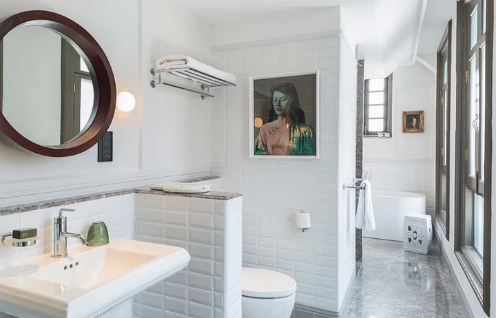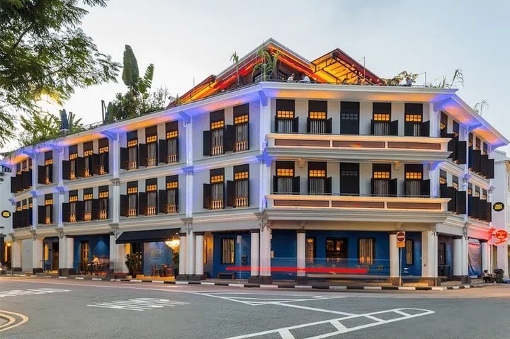 Interior designer Flo Sander of Ithink Consulting Group spruced up both the exteriors and interiors of the four-storey building, while preserving the old-world charm of this 1920s heritage shophouse. To lend contrast and create a standout feature, Flo chose a striking deep blue for the facade on the ground floor. An opulent chandelier hangs at the entrance of the hotel lobby, and many passers-by have stopped to admire the luxe yet edgy aesthetics of the space.
