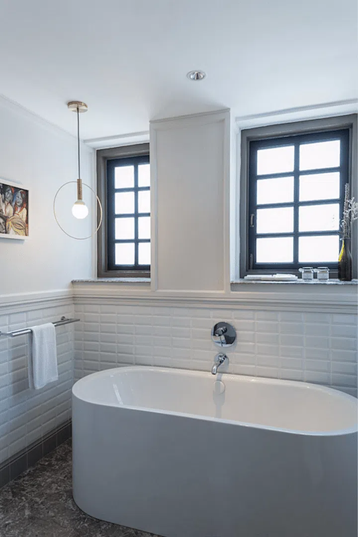 Despite a mishmash combination of styles – from photos of local architecture, to Classicalstyle wainscot panels on the walls and subway tiles in the bathroom – the result boasts an understated appeal and a touch of luxury.