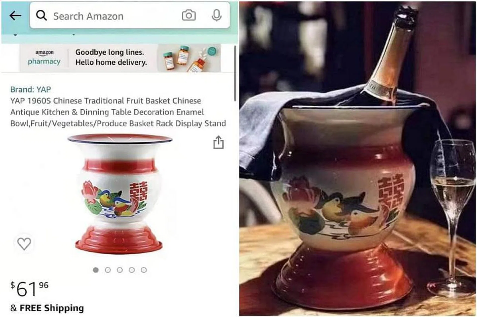 The enamel product adorned with a pair of mandarin ducks and the Chinese words symbolising “double happiness” in red was advertised on Amazon as being a Chinese antique with a wide range of uses, from being a vegetable and fruit holder to an ice bucket, or a decorative display stand.