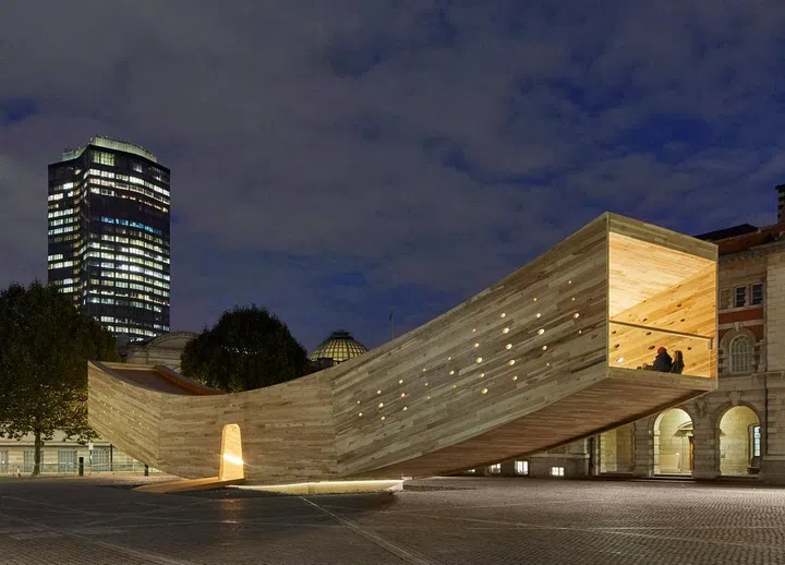 Conceived as a habitable arc poised on the horizon, the pavilion takes the form of a four-sided curved timber tube that cantilevers 12 metres in two directions from its centre point.