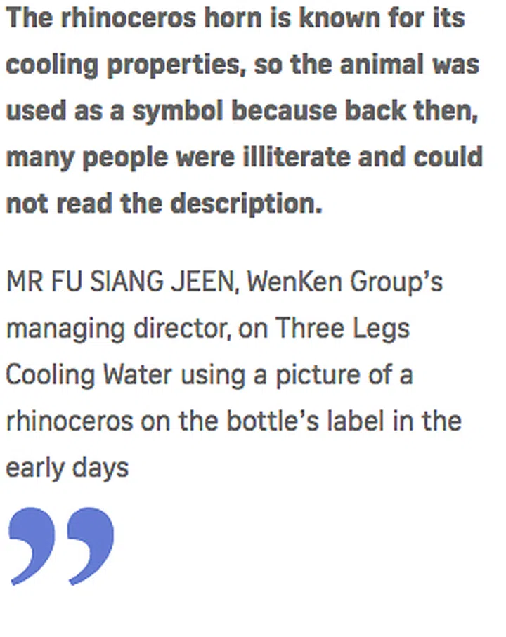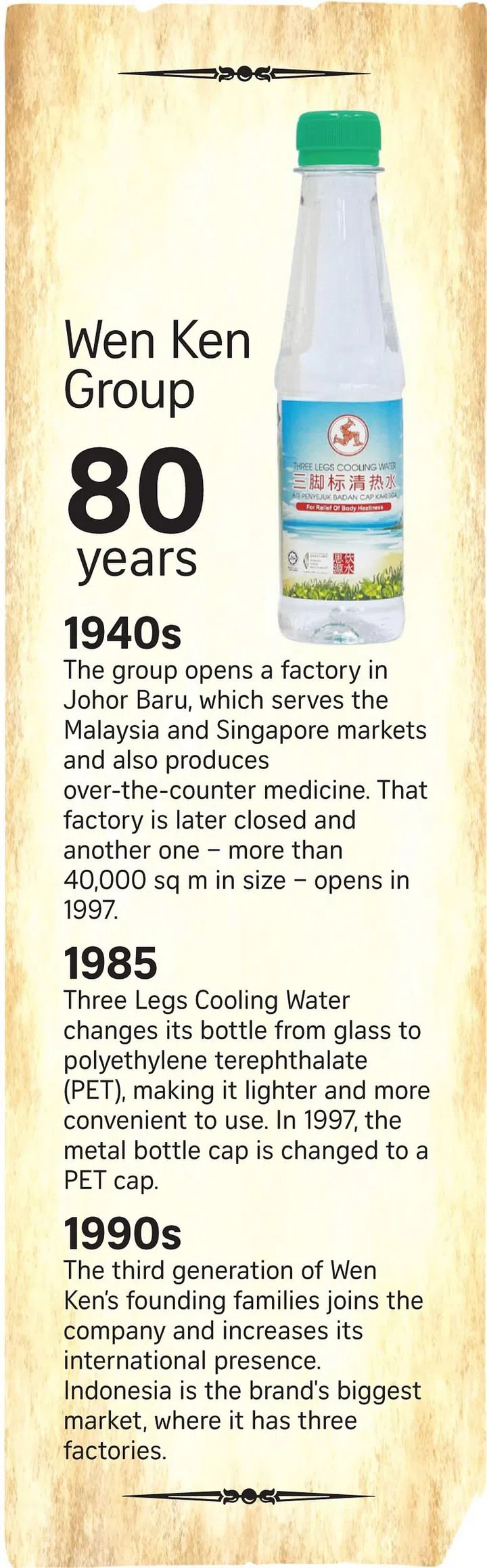 The group's flagship product is its Three Legs Cooling Water, which is formulated with de-ionised water and natural minerals such as gypsum fibrosum and calcitum - meant to relieve heatiness.