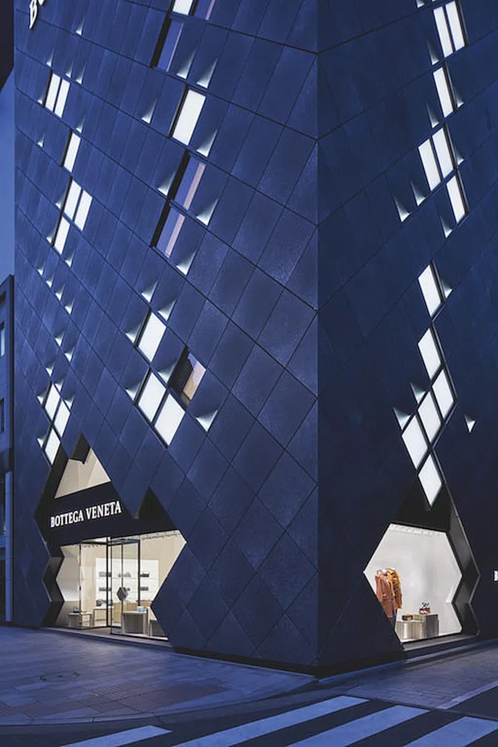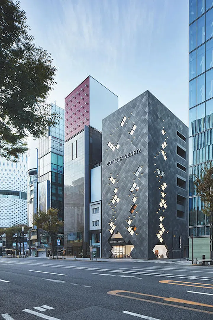 Its facade is made of 900 silvery square metal panels – a reference to the famous intrecciato weave technique created by Bottega Veneta.