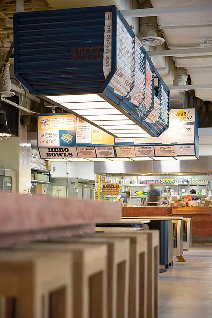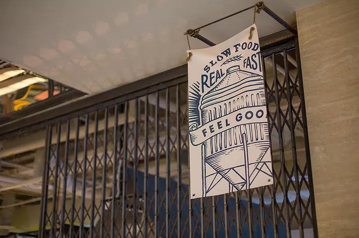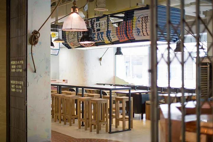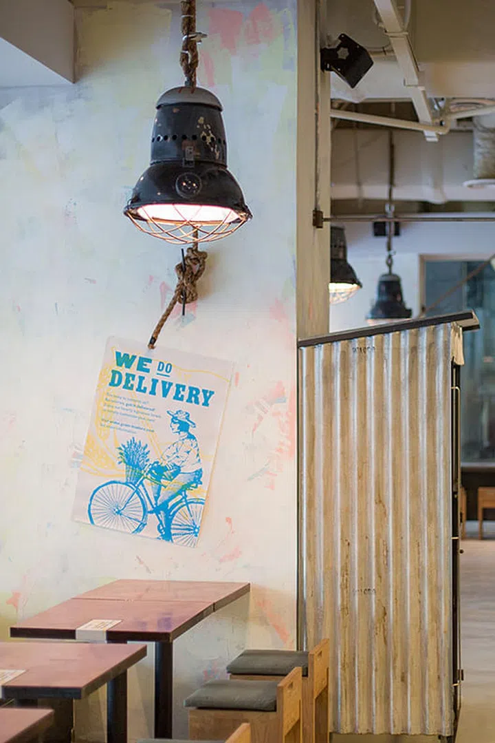 Corrugated metel sheets house the lighting systems illuminating the centre of the dining space. Vintage art prints and writings add a quirky touch to this feature, while complementing the interior style. Long bar tables and stools can accommodate lunch hour crowds.