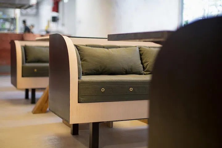The wood tones and curves in the design of the benches add a soft touch to the industrial-look in the cafe.