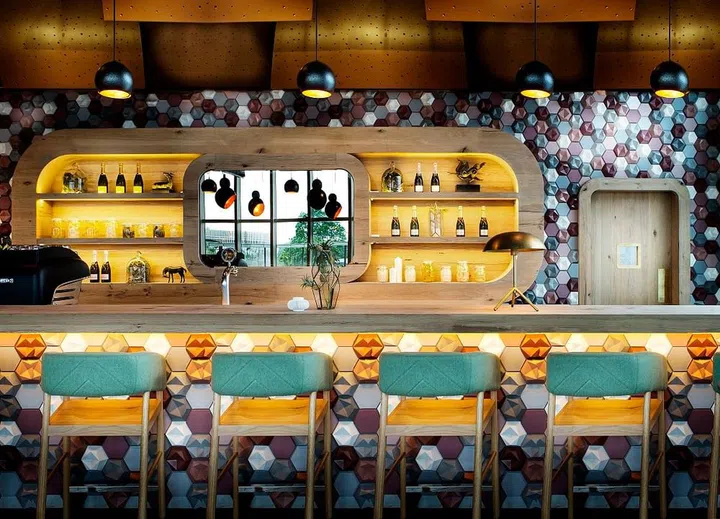 Dressed in warm wood finishes, cosy wool upholstery, and attractive colours, the interiors comprise a mix of geometric and rounded forms.