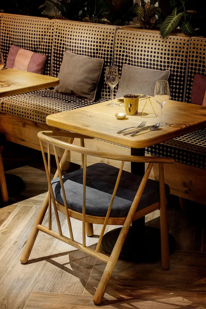 Emma had also designed the loose furniture and lighting with sustainability in mind. Chair backs are upholstered with Leaf recycled wool felt by Kirkby Design, while reclaimed solid oak slabs were used to create the tables.