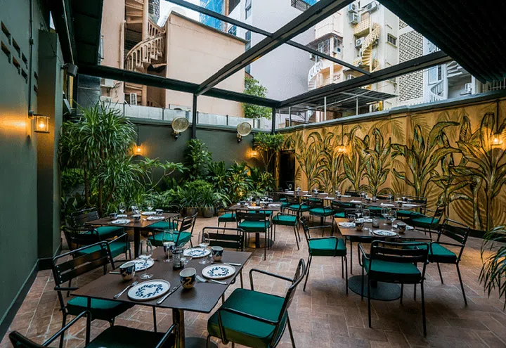 Its postindustrial- chic look is a reflection of its location, as well as its 1950s’ origins as a warehouse, making use of strong, striking materials and textures. A mix of original and new design elements – exposed bricks, old-school mosaic tiles, vintage metal grilles – coupled with dark colours, deep wood tones and a hint of brass, make for a moody and trendy space.