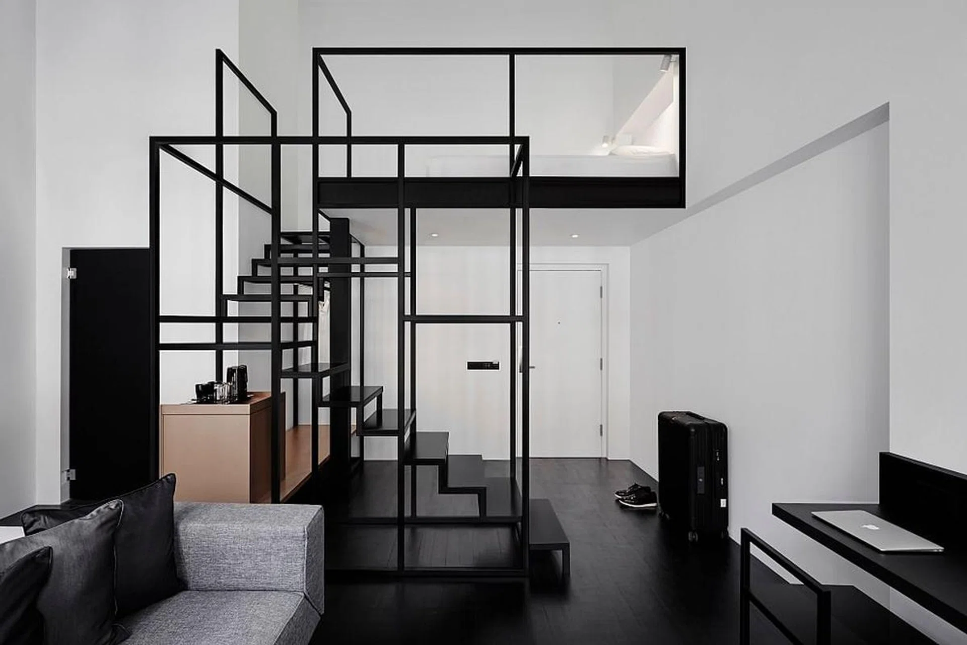 As for the rooms, the most distinctive elements are linear and angular structures, made using 38 by 38cm mild steel hollow sections. Affixed on the whitewashed ceiling and walls, the bars punctuate the space and make for an unexpectedly bold design statement in each room, apart from functioning as clothes hangers and housing LED strip lighting. “The choice of material is simple, but shapes and lines are used to create visual impact,” says William. Owing to the fact that Hotel Mono is housed in a row of shophouses (five three-storey ones and a two and a half storey one), each of the 46 rooms in the 15,000sqf hotel has its own shape. “Different layouts make the rooms interesting — when you return for another stay, you get another experience,” smiles Glenn. Nevertheless, the consistency in design and uniformity is evidently maintained, despite not having a fixed template.