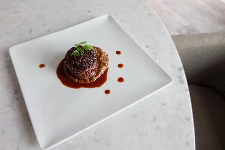 For mains, two choices are available: A Chilean sea bass with sesame quinoa and asparagus tempura, or grass-fed tenderloin with potato puree and a smoked veal reduction (above).