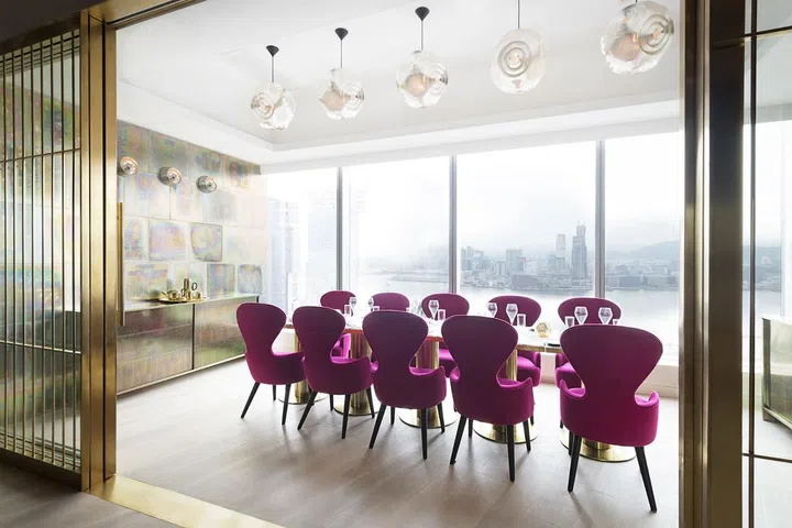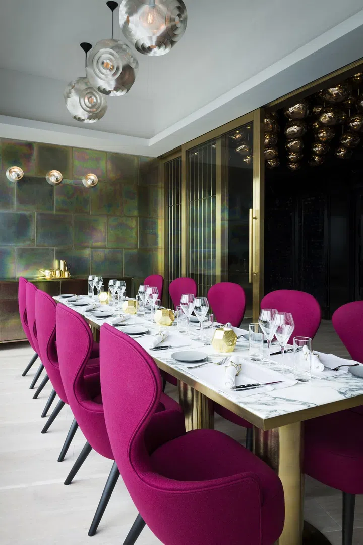 The VIP room features ethereal Tom Dixon Curve pendants and wall lights, chosen for their soft silver finish and perforated surface.