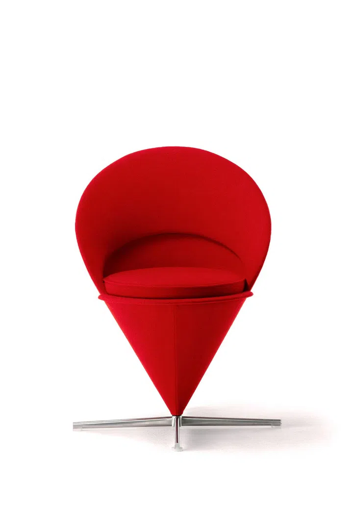 Shockingly revolutionary when revealed in 1958, the Cone chair (by Verner Panton) was originally designed to furnish Danish restaurant Kom-igen on the island of Funen, and to match its interior concept featuring five shades of red.