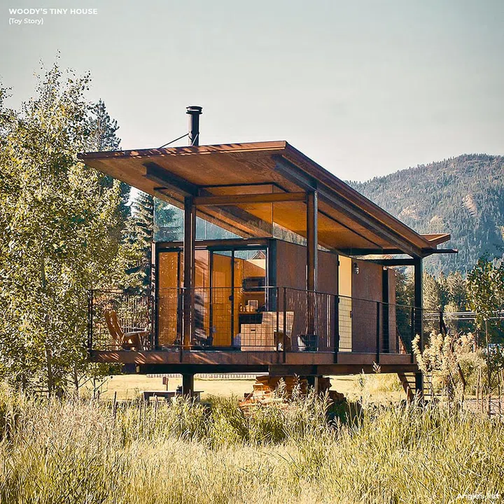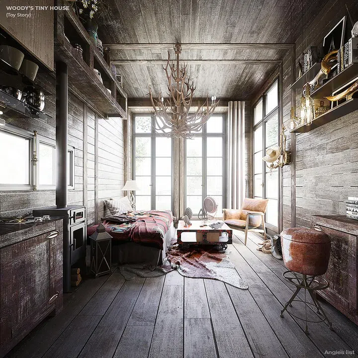 Toy Story's old-fashioned pullstring doll Sheriff Woody Pride, affectionately known as Woody, doesn't actually have a home of his own since he originally lived in Andy's house. But as a nod to his cowboy roots, the artists dreamt up Woody's residence with a vintage western style - solid wood interiors, rustic cabinets, a hat stand for his cowboy hats, and even a 'bookshelf of curiosities".