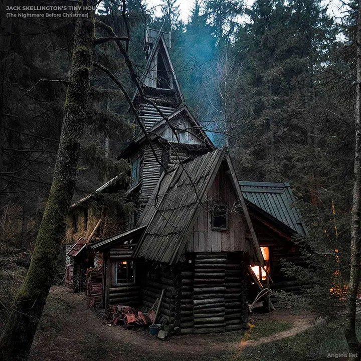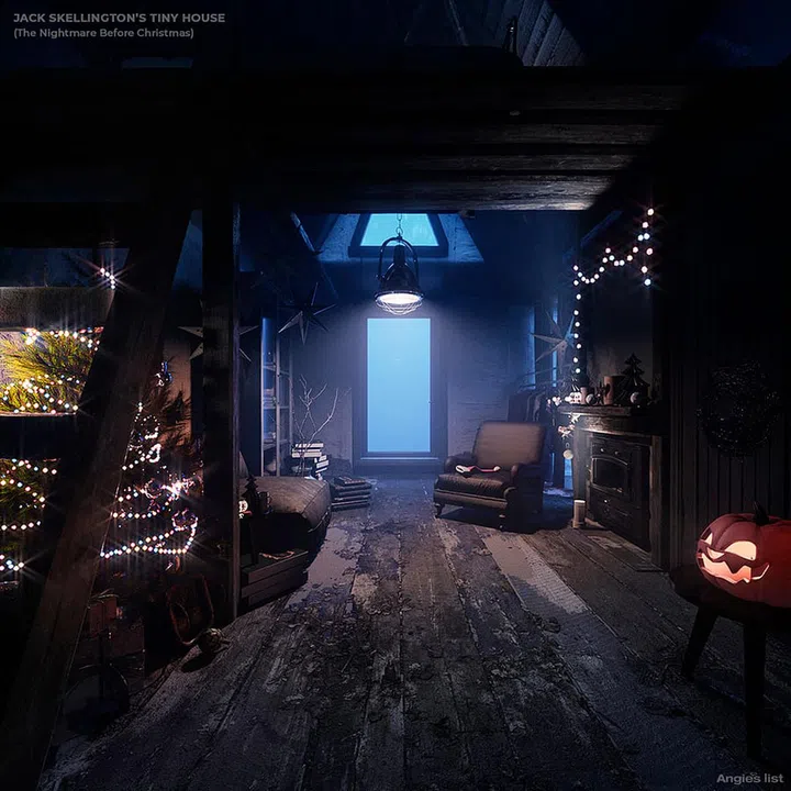 Jack Skellington is the main protagonist of Disney’s stop-motion feature The Nightmare Before Christmas. As the leader and “Pumpkin King” of Halloween Town, it's no surprise his modern tiny house has a brooding, gothic feel to it, with faded wooden slats and beams accented by dead branches and lifeless trinkets. And of course, his favourite holidays - Christmas and Halloween - are woven into the decor.