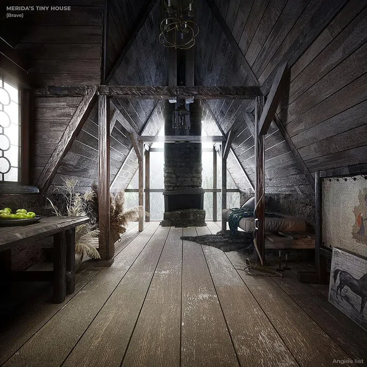 Its interiors are simple, sparse and no-nonsense, much like the character, but features Scottish influences. It exudes a natural and rustic vibe, with a Celtic cathedral-like window, a medieval-styled fireplace and bold colors for the rug and chair. There's even a vintage painting of Angus, Merida’s famous and faithful Scottish Clydesdale steed.