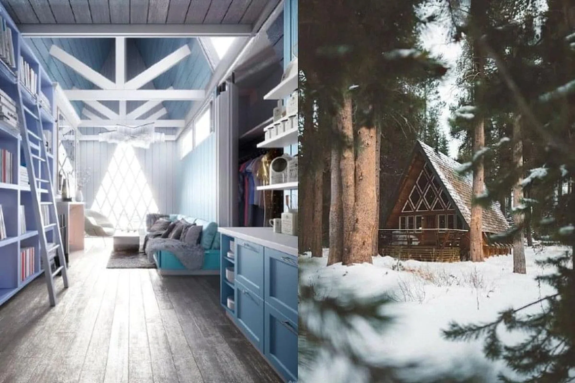 On the outside, exposed wood is reminiscent of the Enchanted Forest, which Elsa ventures into and remains in Frozen II. The cabin's windows take their cue from the carved ice effect of Elsa's Ice Palace. Its design also stays true to the Norwegian influence observed in the animated movie's architecture.