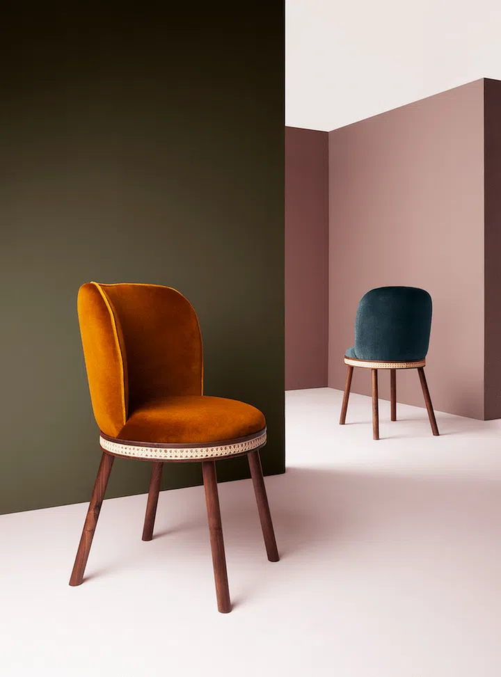 Choose from exotic shades like curry yellow, burnt orange or terracotta, or opt for dark hues such as emerald green and midnight blue. Pictured is the refined and sensual Alma chair and stool by Dooq; clad in velvet upholstery and solid walnut legs mix classic and modern aesthetics in graceful harmony.
