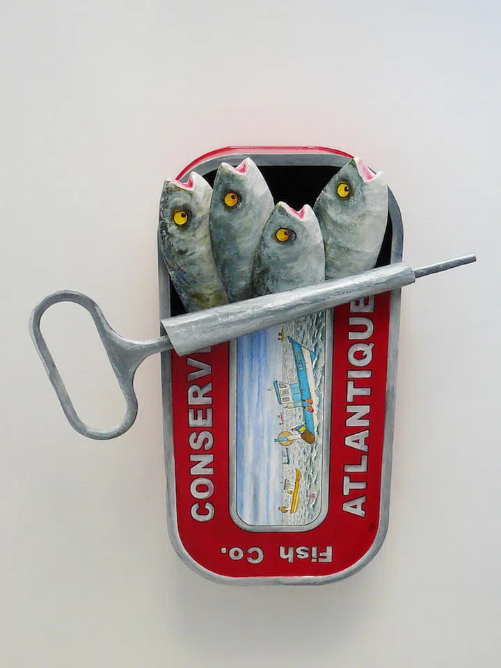 Pictured is the Conserve Atlantic 3D sculpture by French artist Philippe Balayn. He imagines hyperrealistic and humorous papier mache wall sculptures inspired by the marine world, which he paints and varnishes to form oversized tins of sardines, mackerel, tuna or cod, with the fish heads sticking out in a graphic style reminiscent of comic strips.