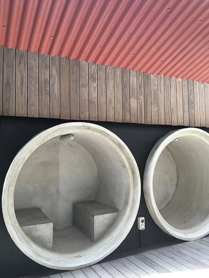 Pre-cast concrete pipes are inserted below the amphitheatre as hideout nooks and offer spaces for rest for visitors as well as provide unique play possibilities for families with children.