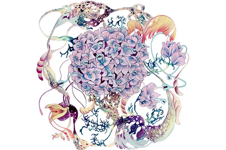 Flowers are more likely to come with mouths, tentacles and other appendages in Adeline Tan’s world. Take Singapore Girl (above) for instance – on first view, it’s an art illustration of what seems to be a cluster of lavender hydrangeas. Look closer, and teeth appear amidst the petals, with the plant looking more poisoned with purple than just pleasantly pastel (shudder).