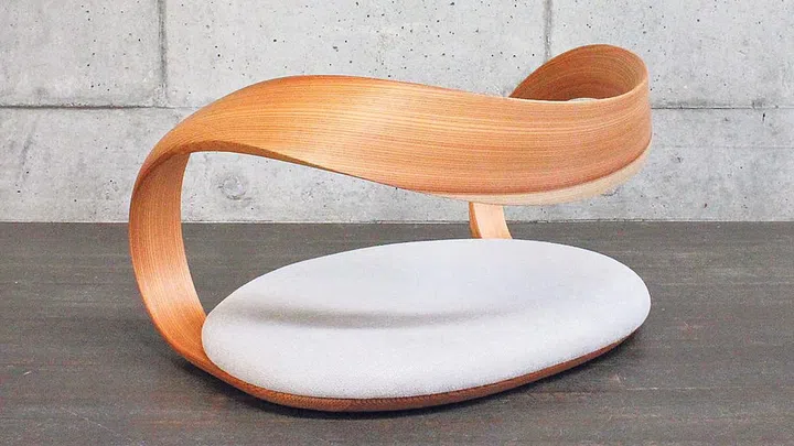 Woodmaker Kenta Hirai specialises in the technique of “free form lamination”, which involves layering thin slices of Yoshino cedar, and crimping them into shape. This technique preserves the warmth of cedar, while making the pieces strong enough to be used as furniture. The curved arm and back of his Legless chair are made using this method.