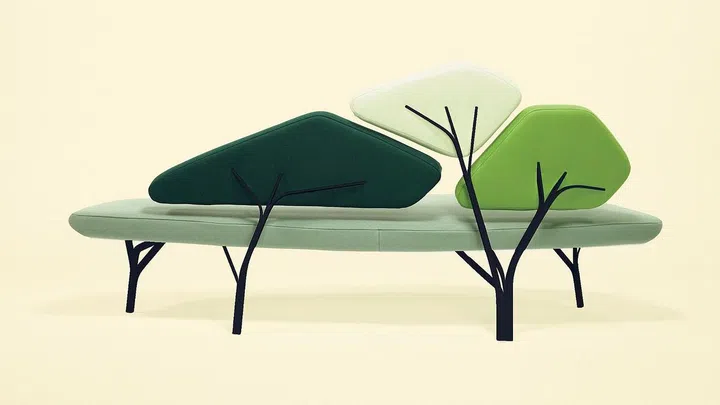 This sculptural piece is named after the pine trees grown in the gardens of Villa Borghese in Rome. The wool-covered cushioned seats resemble the leaves, supported by a steel ‘tree branch’ framework. The Borghese Sofa was designed for La Chance.