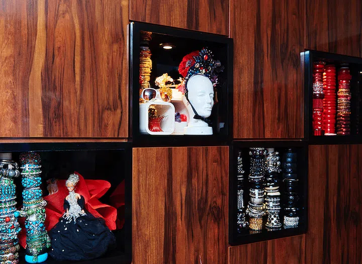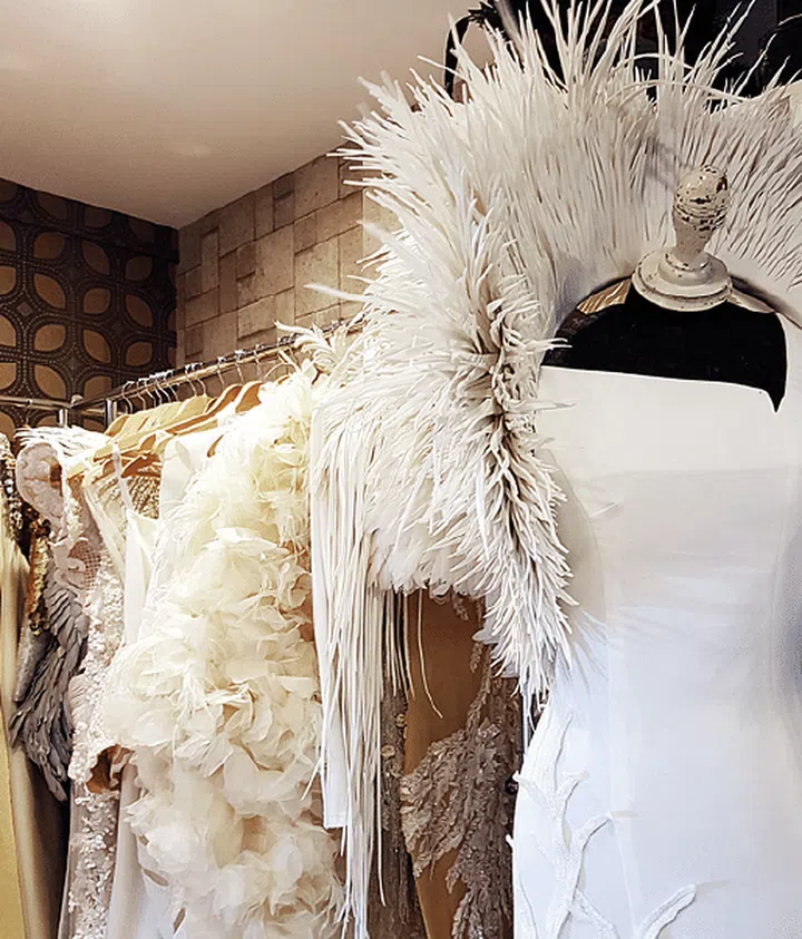 Every corner is filled with knick-knacks in vibrant colours and with textural appeal, while a full-height bookshelf takes centre stage, showcasing many of Frederick’s favourite reads. Amid the organised chaos, the intricate designs of his gown collection stand out prominently, owing to his use of eye-catching materials, such as exotic feathers, sequins and crystal beads that glitter in the light.