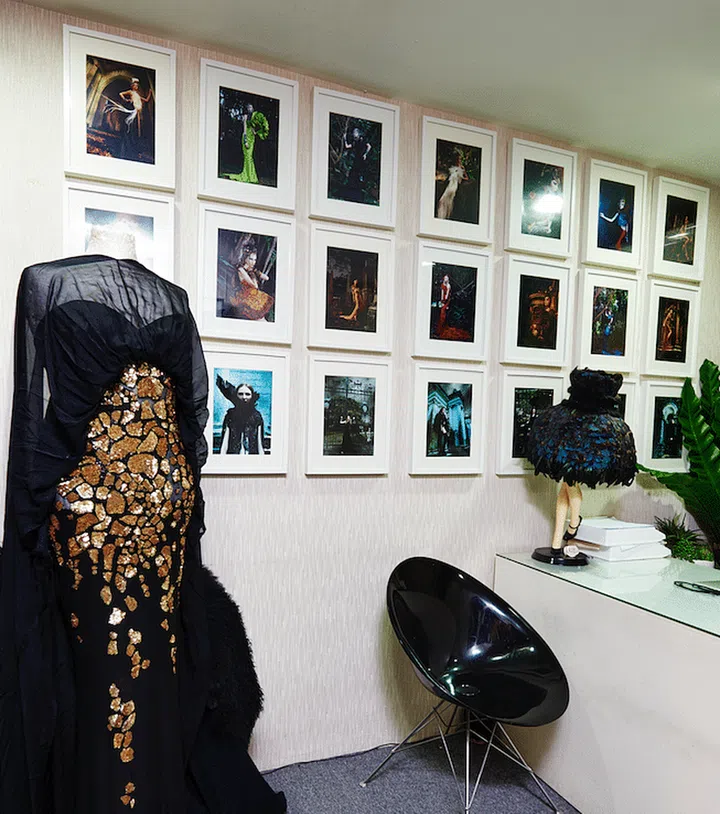 Images from his previous collections line the walls of the studio.