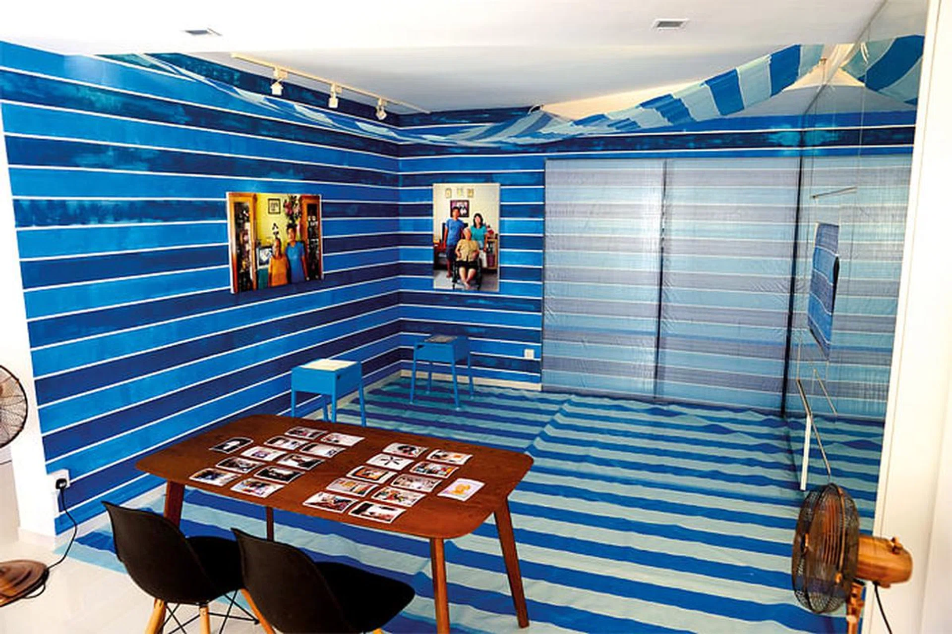When homeowners agree to become gallerists for OH! Open House, they may either see a small change to their home or there could be a complete renovation of their living room—as in the case of Karen and Laurent, who exhibited Hafiz Osman’s Blue Canvas Walls in their home. Osman used the blue striped tarpaulin, ubiquitous in building sites, to form a cosy nook in which people can gather together. Osman, who grew up in a kampong, also went as far as to knock on the doors of Karen and Laurent’s neighbours, offering to paint their walls as well so they could also be part of the project. He then photographed the neighbours against the freshly painted wall in their homes and included the shot in his Blue Canvas Walls installation.
