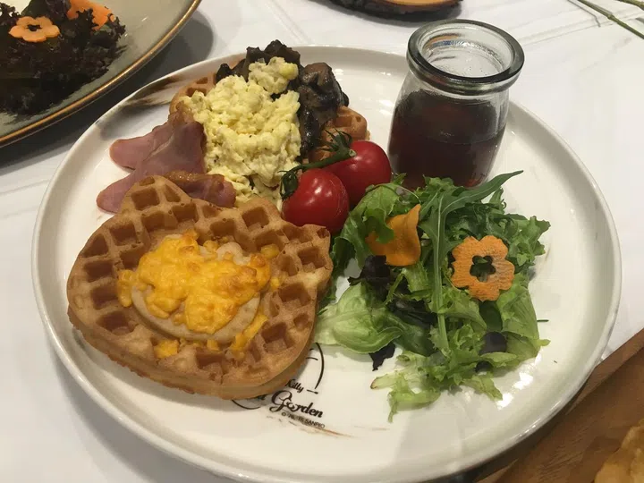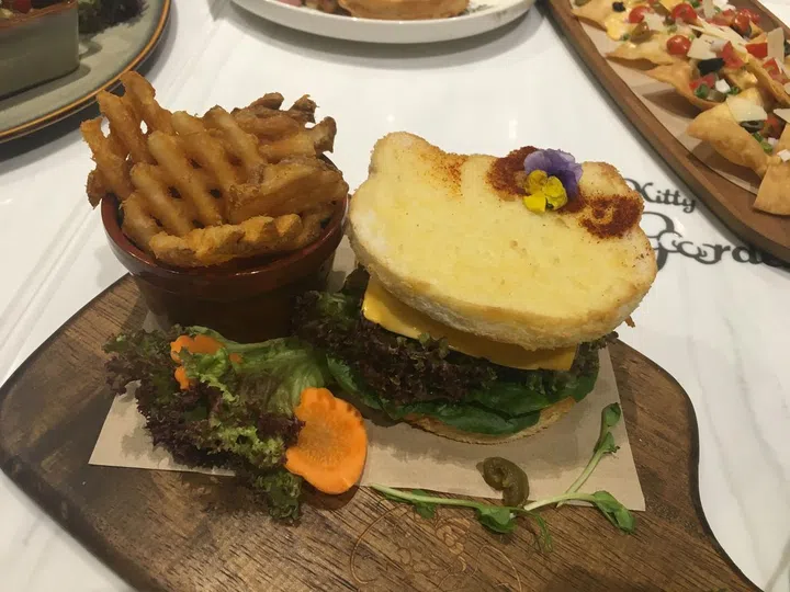There is a wide range of offerings, from all-day breakfast and sandwiches to main courses and desserts. Some examples are Let's Do The Salsa ($16.50) — a Kitty-shaped salsa chicken sandwich and Big Breakfast Surprise ($18.50) — waffles with cheese, also shaped like Kitty, along with the usual supsects.