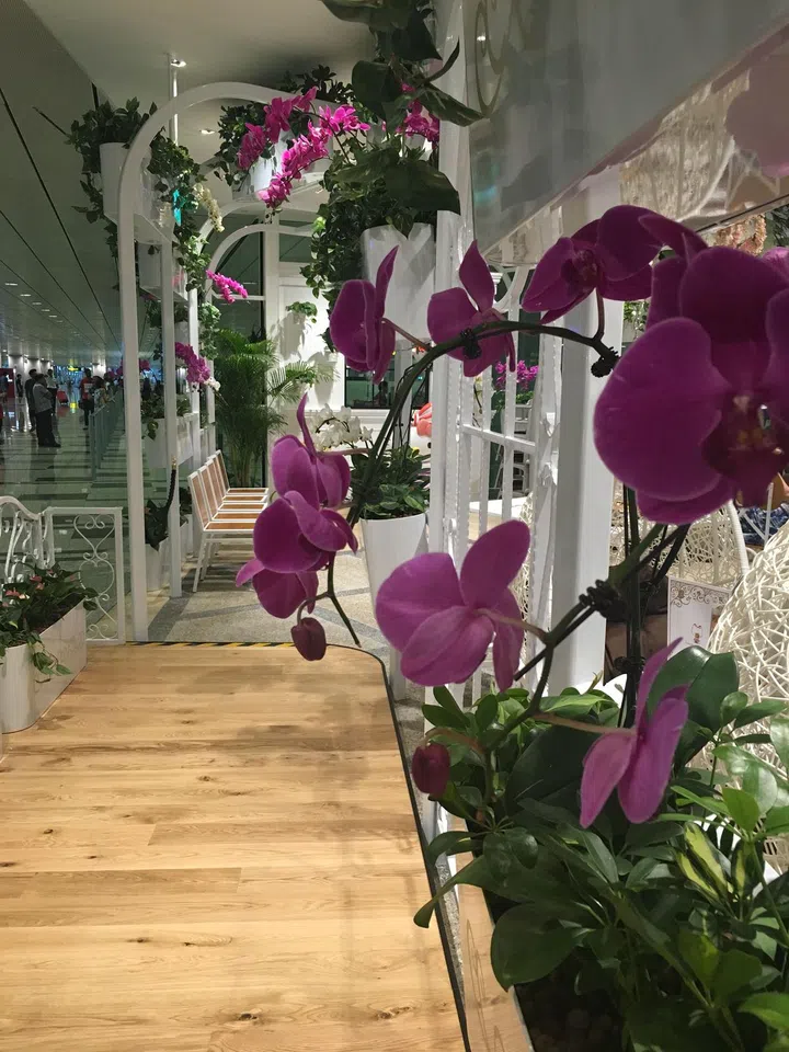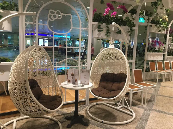 Located at level one of Changi Airport Terminal 3 Arrivals area, Hello Kitty Orchid Garden takes on an European-style garden feel with design features that look like trellises or arbours. The space is also extensively adorned with both real and artificial Orchids and other plants, inspired by Singapore's national flower and "garden city" vibe.