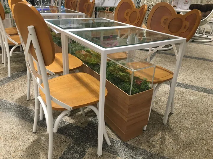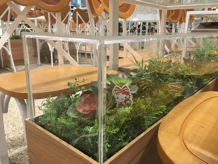 Furniture is customised — tables have motifs of the famous and beloved Sanrio character and chairs have the iconic bow incorporated into backrests!