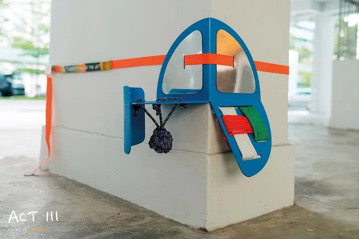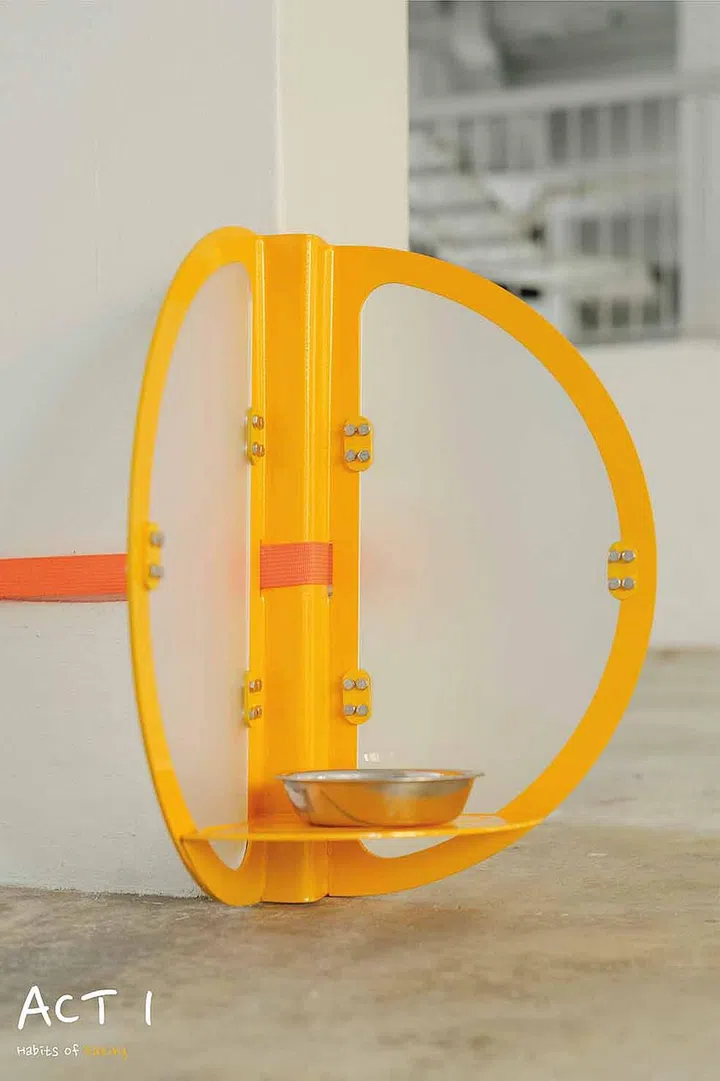 Act 1 – Habits of Eating is a corner for cats to eat in peace, with semi-opaque screens at the sides for privacy. Act 2 – Habits of Resting provides an elevated space for cats to sleep on, safe from wet or dirty floors. Finally, Act 3 – Habits of Curiosity lets the cats indulge in multisensory play with ropes for scratching and mirrors to look into.