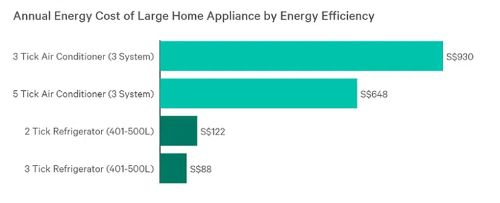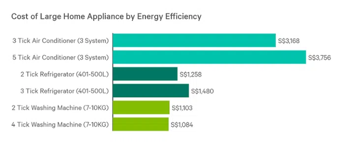 When comparing the upfront purchase price of appliances, it may seem that energy efficient ones are indeed more expensive than their more energy-intensive counterparts. For example, 5 tick air conditioners cost about S$600 (or 19%) more expensive than 2 tick air conditioners on average, while 3 tick refrigerators cost about S$200 (or 18%) more expensive than 2 tick refrigerators. Washing machines were an exception, where we saw minimal price difference between different energy consumption ratings.