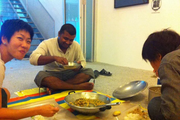 My Life So Far: Ms Tan (left) having dinner with Bangladeshi worker Ibrahim in 2012 at the Lorong 24A Shophouse Series art show. On the right is writer Amanda Lee Koe. (Photo: Courtesy of Karen Tan)