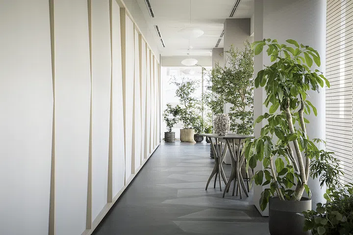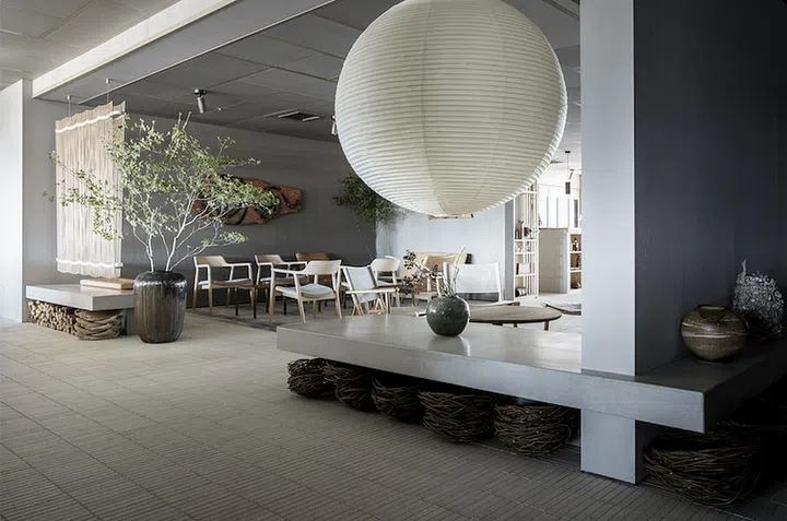 A colour palette of muted warm grey hues, blue, green and burnt clay tones runs through the restaurant, with darker and lighter shades used to divide the space and provide ambient zoning. Enhancing the overall interior design is the ceiling grid design inspired by the lines of tatami flooring.