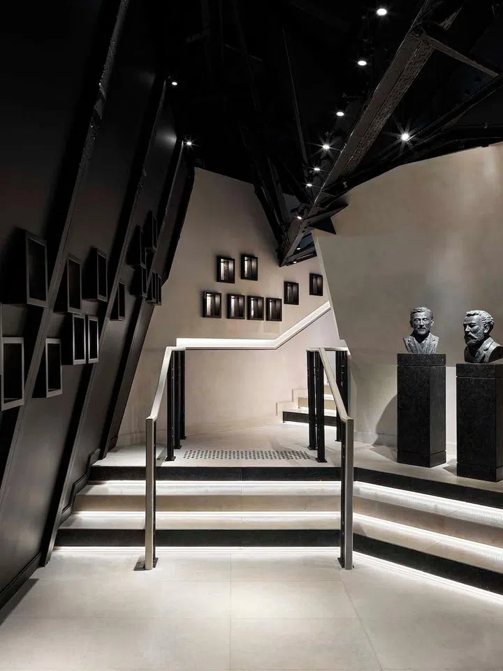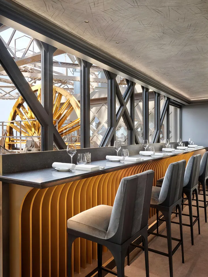 The circular overhead lighting fixtures in the dining spaces mimic the mechanical wheels spinning in the tower. And the silver velvet banquettes as well as two chair designs – the curved-back cane Lace chair and the Iron Lady, an elegant seat with arched legs and intricate sculpted details inspired by influential, 20th-century French jewellery designer Paris Suzanne Belperron’s 1930s fine jewellery – are a classy complement to the French oak tabletops with mother-of-pearl.