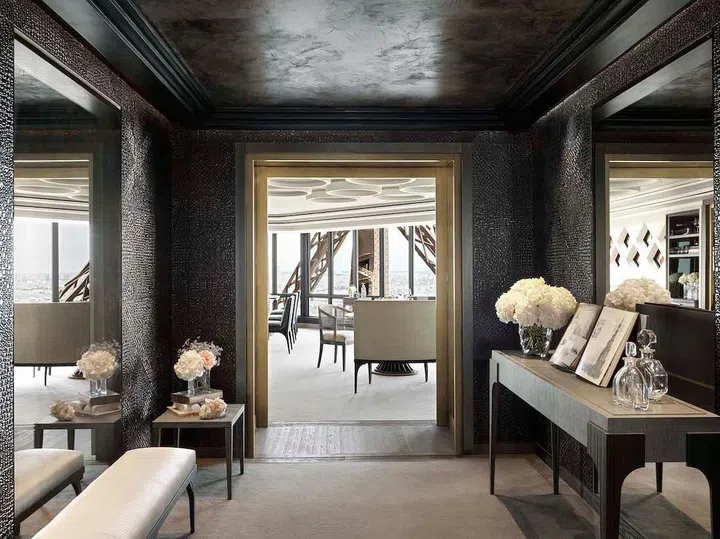 Taking inspiration from the Eiffel’s moniker, “the Iron Lady”, Lebanese architect Aline Asmar d’Amman presents a silver-gray, black, gold and white palette with a feminine twist paralleling the raw industrial tones of the Eiffel’s wrought-iron lattice structure.